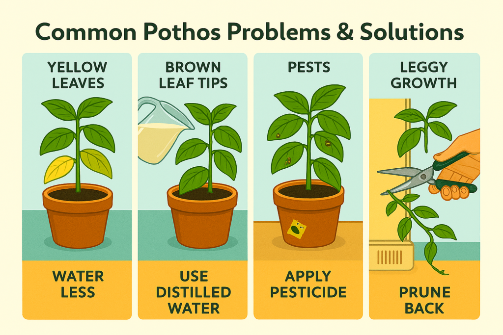 Even though pothos are incredibly easy-going, I’ve encountered a few issues over the years that are worth sharing. The most common problem I see is yellowing leaves, which usually means you’re watering too frequently. If you notice yellow leaves appearing regularly, especially from the bottom up, cut back on watering and make sure your pot has good drainage.